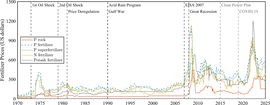Third, with growing demand for phosphorus-derived products globally, supply gluts caused by centralized resource stocks and production systems are likely contributing to relative market volatility and rising prices in recent decades. Global fertilizer markets have shown susceptibility to recent global shocks, but unlike energy commodities, price recovery in fertilizer markets has been affected by trade policy decisions. The COVID-19 pandemic and subsequent conflict in Ukraine resulted in protectionist trade policies in some key supply regions that limited both raw material and fertilizer availability in the global market. There is now early evidence that the conflict-driven closure of the Strait of Hormuz is limiting trade in already strained fertilizer markets, suggesting a continued bumpy road for global phosphate and fertilizer markets. The near- and long-term implications of these compounding events remain to be seen, but as the last six years have shown, higher fertilizer prices and price volatility could adversely impact U.S. and global food systems.